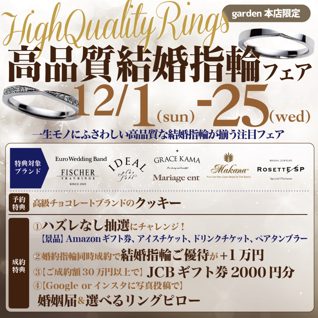 必ず当たる!サイコロ振って現金ゲット! 新年初売りブライダルリングフェア - 婚約指輪・結婚指輪選びがお得に - 1/2(金)~ 1/12(月) garden本店では1/2~新年初売りブライダルリングフェアを開 … 続きを読む 新年初売りブライダルリング(婚約指輪・結婚指輪)フェア 必ずもらえる!現金プレゼント