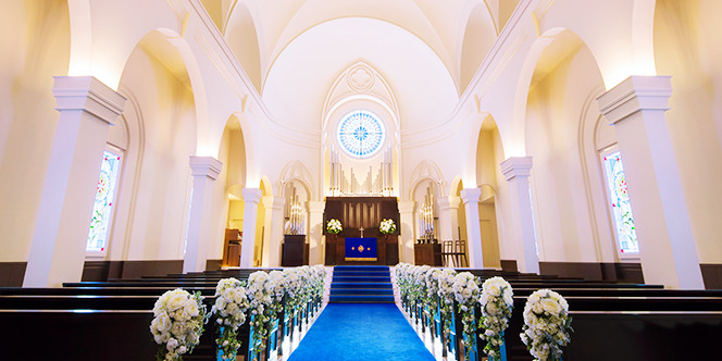 ロイヤルブルーのヴァージンロードに一目ぼれする花嫁様も多いアニヴェルセル。
