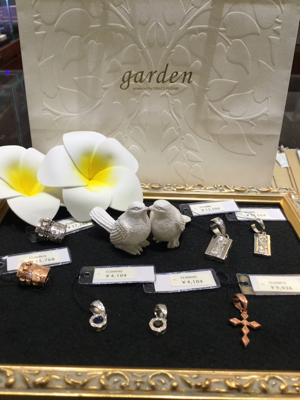 こちらは、ペンダントトップ。ハワイアンジュエリー独特の彫り模様には、それぞれ意味があり、例えば、プルメリアの花は幸福の象徴。波は「永遠の愛」を表します。
