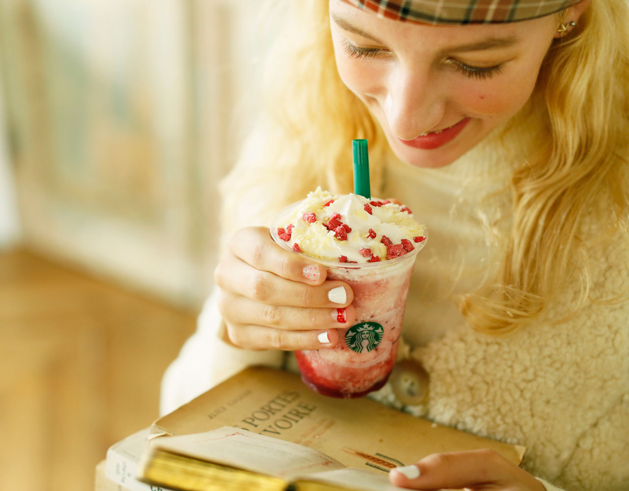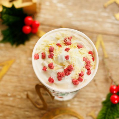 ホワイトモカはメレンゲの上に、フラペチーノはホイップの上にラズベリー風味の
