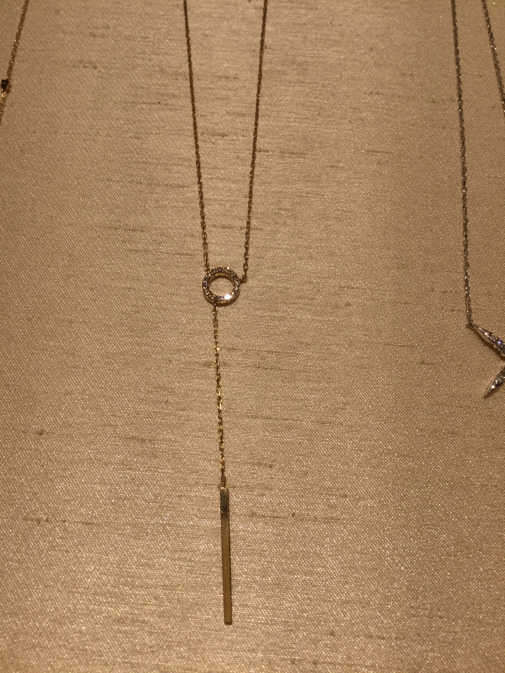 ダイヤのリングに、バーが下がる大人なネックレスです。シンプルなセーターも、このネックレス一つで、普段着が、ガラリとお洒落に変身します。