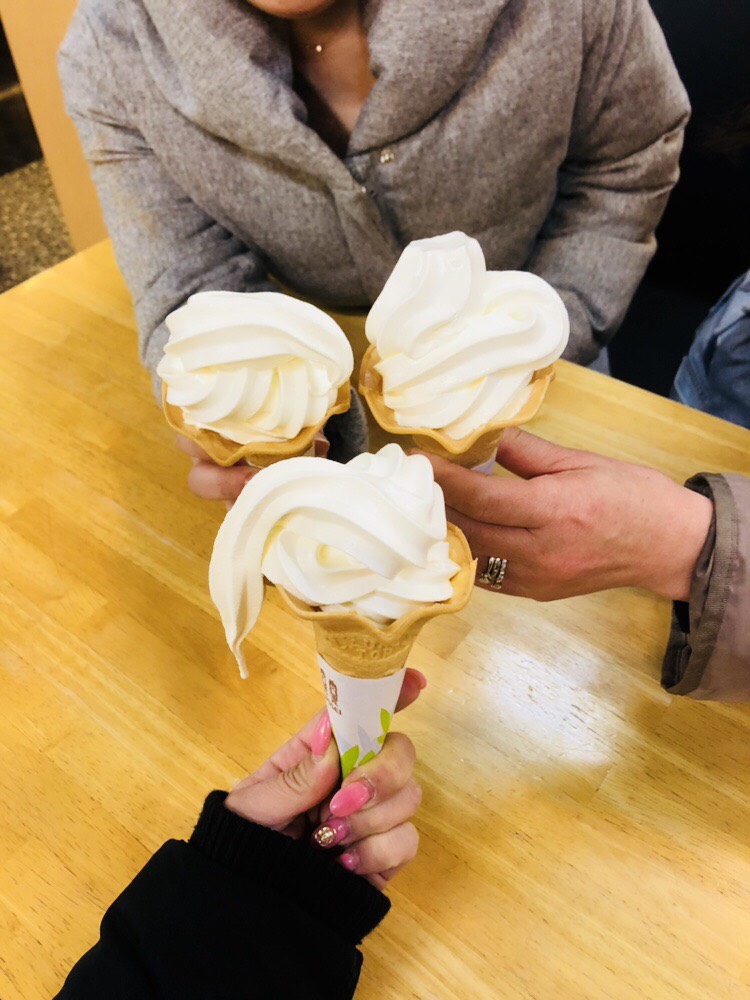 ここのソフトクリームが美味しいと、夜遅くに食べに立ち寄りました。3人で頼んで、フードコートのおばちゃんが作ってくれた3つのソフトクリーム。