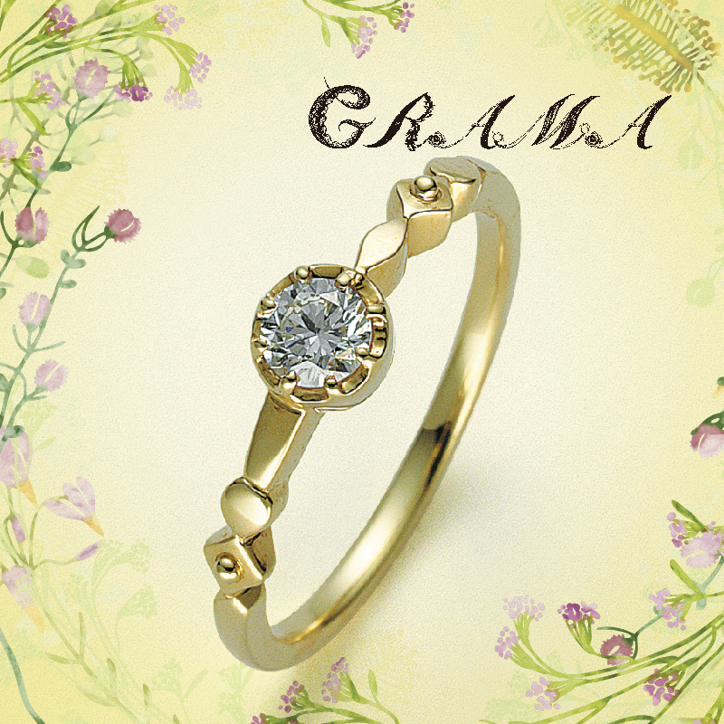 ブランド名のグラマも「牧草」の意味がありますが、私たちの身近なハーブの名前と、花言葉にまつわるリングへの想いに優しさ満たされる気持ちになる。そんな結婚指輪と婚約指輪です。