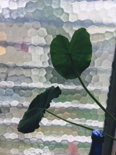 実はこの葉っぱは、以前買った里芋を、使わず置いてあったところ、芽が出てきたものなんです。かわいかったので、そのまま水栽培してみたら、こんなに長く成長しました。