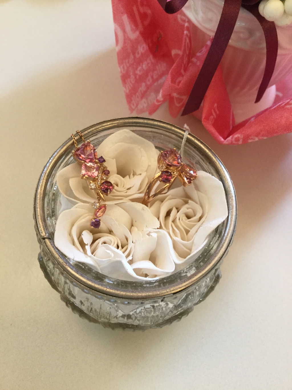 画像は、ピンク系の半貴石を集めた、透明感あるネックレス&リングです。メインの石がハートシェイプでキュートですよ。セットで使うのも◎です♪