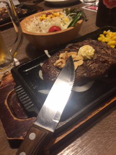 そして、ご覧ください!!ステーキよりもむしろ、このワイルドなナイフにインパクトを感じてしましました! 笑