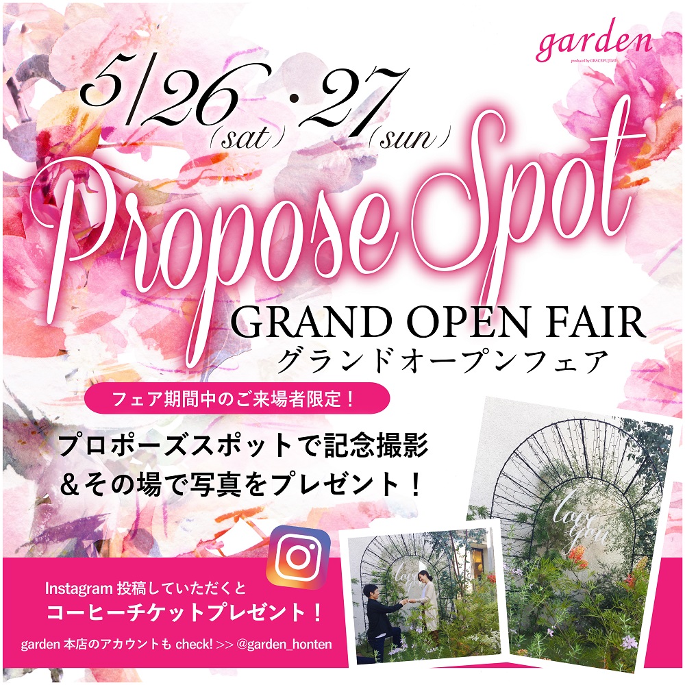 garden本店のプロポーズスポットのグランドオープンを記念して、5月26日(土)、27日(日)イベントを行います。