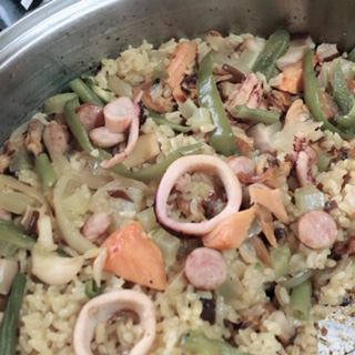 スペインのお土産にパエリアのスパイスミックスを頂いたので、冷蔵庫にあった野菜と、冷凍の魚介類とで、早速作ってみました。