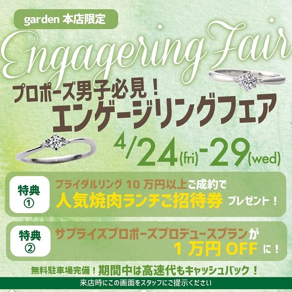 ~4/29(水)までの期間エンゲージリングフェアを開催中です![]()