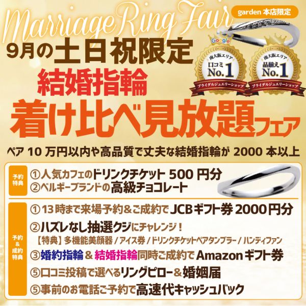 関西最大級の品揃えを誇るgarden本店、こちらのフェアでは沢山のブランド、結婚指輪デザインを着け比べしていただけます。