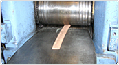 圧縮した地金を60tのプレス機でくり抜きます。くり抜いた地金の輪っかを内側から圧力をかけて伸ばす『圧延』という作業もしていきます。