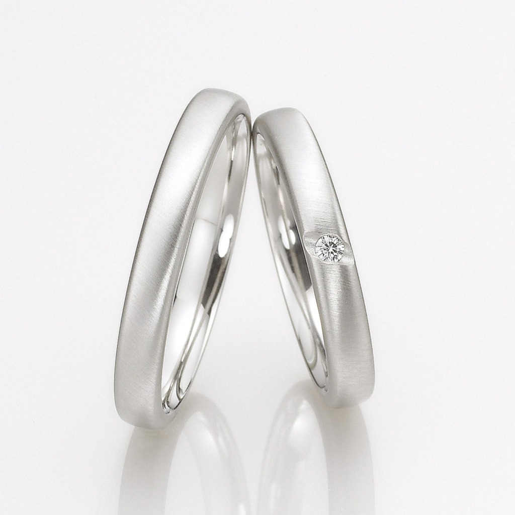 白い:「清らかな純潔」結婚指輪中央に配されたミル打ちが印象的。レディースには白いダイヤ、メンズにはブラックダイヤが輝きます